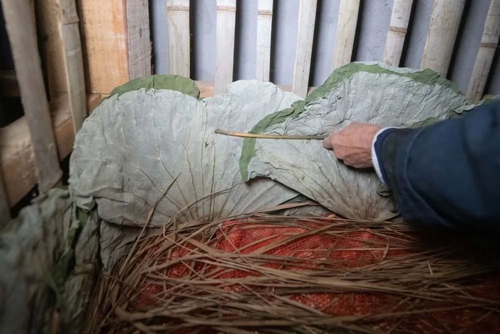 11月7日,当日是立冬,在安徽省铜陵市郊区大通镇大院村的一座姜阁里,村民用荷叶分隔放置其中的姜种。