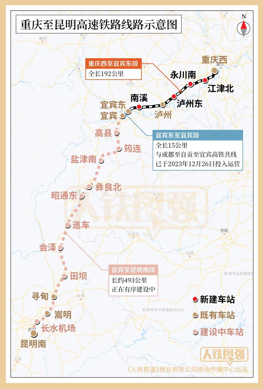渝昆高铁是国家“八纵八横”高铁网京昆通道的重要组成部分,全长约700公里,设计时速350公里,其中宜宾东至宜宾段全长15公里,与成都至自贡至宜宾高铁共线,已于2023年12月26日投入运营;重庆西至宜宾东段全长192公里,于2024年9月29日开通运营;宜宾至昆明南段长约493公里,正在有序建设中。