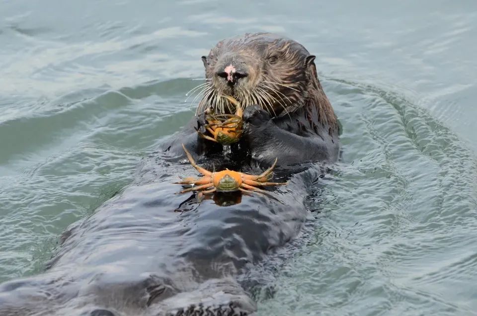 海獭正在啃一只满是蟹卵的雌性滨蟹 | Michael Yang但是,在加州唯一一个有海獭的河口埃尔克霍恩沼泽地,令人惊奇的事情发生了。用不着人类的干涉,靠着海獭的好胃口,螃蟹的数量就完全得到了控制。海獭没有可以保暖的鲸脂(海洋哺乳动物皮下的脂肪),每天需要吃下相当于体重重量25%的食物,才能支撑自己的能量消耗——而螃蟹就是它们最爱的食物之一。保护区的研究员估计,这里的海獭每年能吃掉5万~12万只普通滨蟹。
