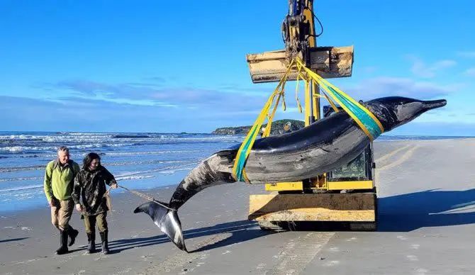 今年7月冲上海滩的雄性铲齿喙鲸 | NZ Dept. of Conservation今年7月,一条长达5米的雄性铲齿喙鲸尸体被冲上新西兰的海滩,这是有史以来第一头完整的标本。最近,科学家对标本进行了解剖,发现它的下颚骨折,头部和颈部都有淤青,这可能就是它死去的原因。