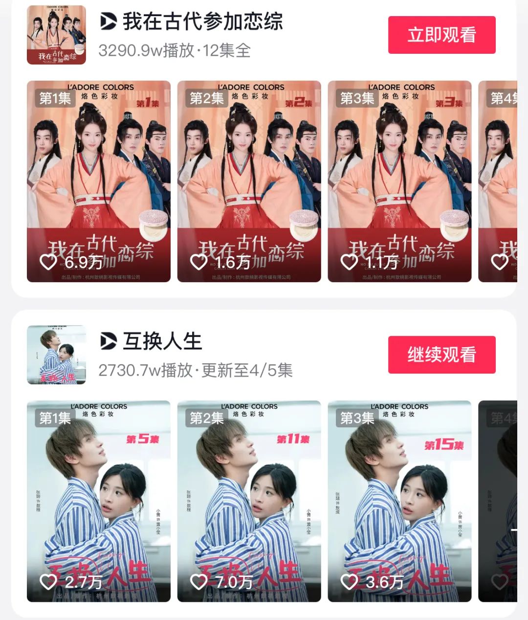 只是现在的玩法,除了去年火热过一阵的达人定制短剧,变成了更有内容属性的品牌自制剧和付费植入剧。在后链路上,更是出现了达人下剧后直接上播、播后落地搜索等玩法。《我在古代参加恋综》短剧上线后,店播+达播总GMV超过4700万,烙色一举成为抖音彩妆榜前三。