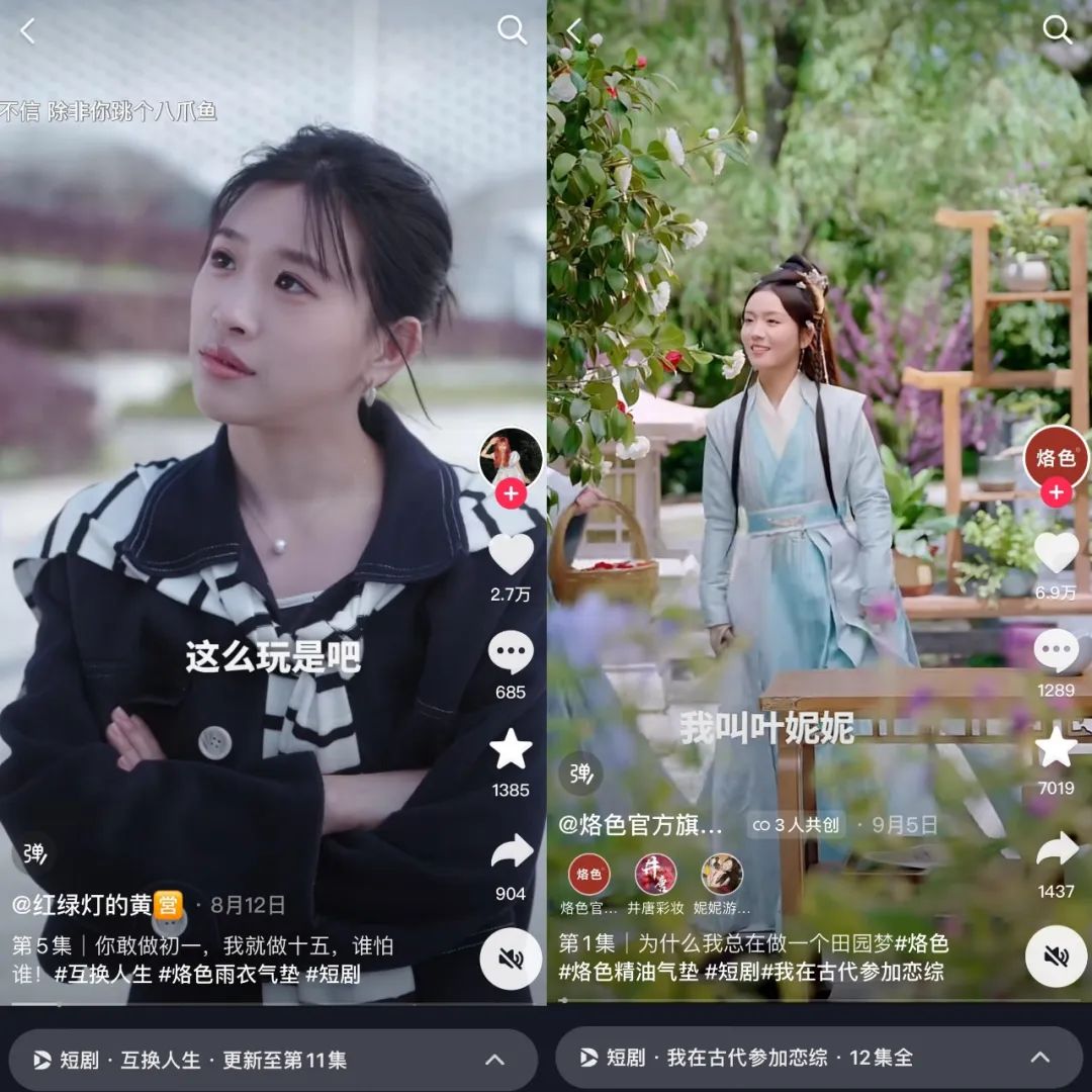 比如烙色彩妆定制短剧《互换人生》主演原是三只羊旗下的@红绿灯的黄,通过此剧转型成演员。烙色定制的另一部短剧《我在古代参加恋综》主演是彩妆头部主播妮妮,短剧上线后,店播+达播总GMV超过4700万,对烙色成为抖音彩妆榜前三起到了很大作用。