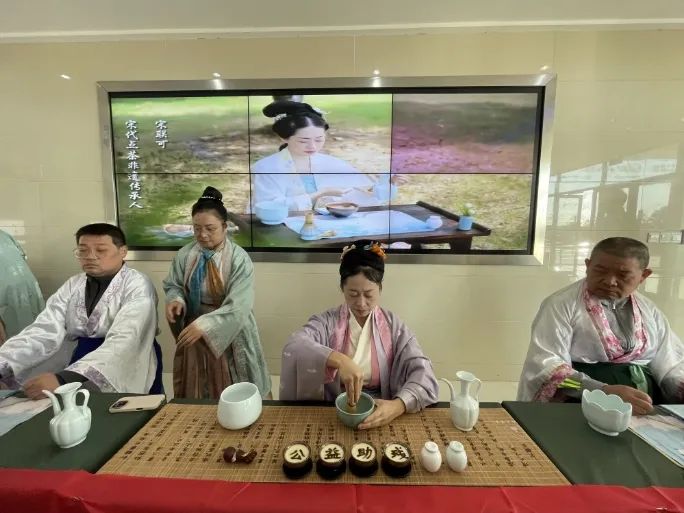 宋代点茶非遗传承人宋联可身着汉服端坐在长桌前,向周围的残疾人传授着点茶技艺,其点茶动作宛如一场精心编排的舞蹈。