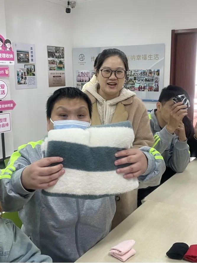 托养中心正在进行收纳培训,一位残疾人朋友将叠好的衣服展示给记者看。2018年3月,托养中心成立了辅助性就业示范车间,依托残疾人辅助性就业劳动产品调配中心,从现有产品种类中挑选出适合的配送到辅助性就业示范车间。并在辅助性就业示范车间配备固定指导人员,使有劳动能力、有就业能力的残疾人都能解决就业问题。截至目前,托养中心辅助性就业示范车间常驻残疾学员16人,流动培训学员20人,其中学员最高收入达1500元。