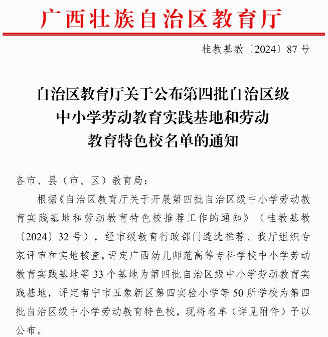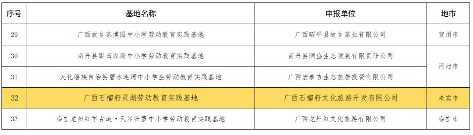 近日,自治区教育厅发布了《自治区教育厅关于公布第四批自治区级中小学劳动教育实践基地和劳动教育特色校名单的通知》,评定了33个单位为第四批自治区级中小学劳动教育实践基地。其中广西石榴籽灵湖劳动教育实践基地入选获评名单,成为来宾市唯一获评的自治区中小学劳动教育实践基地。