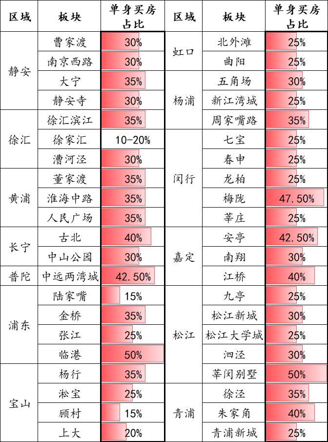 市区板块的单身购房比例要普遍高于市区以外,浦西的占比也要高于浦东