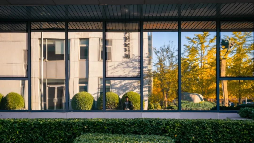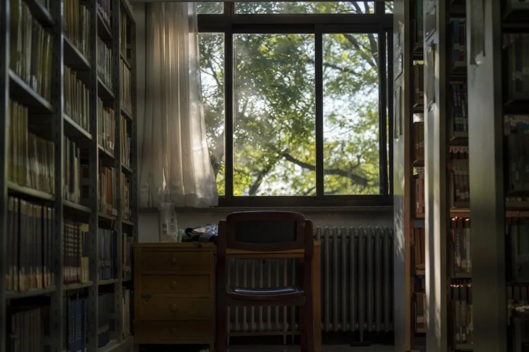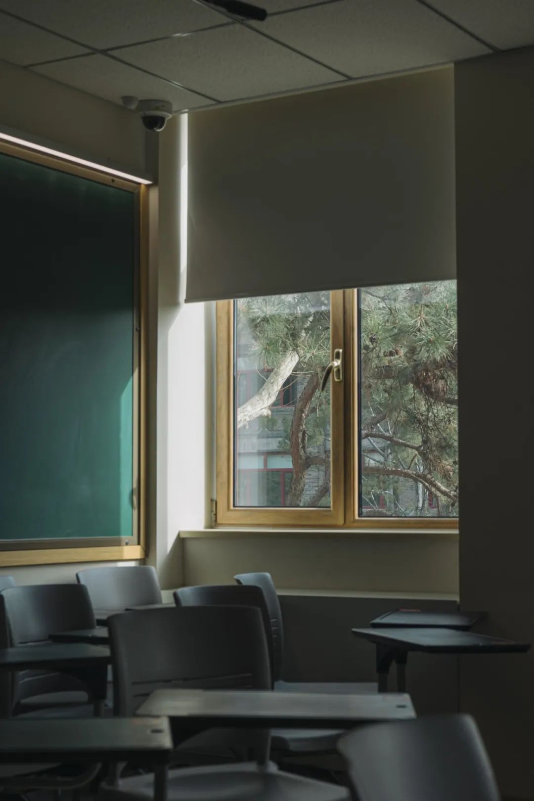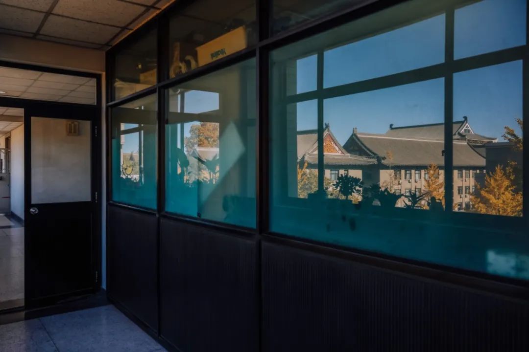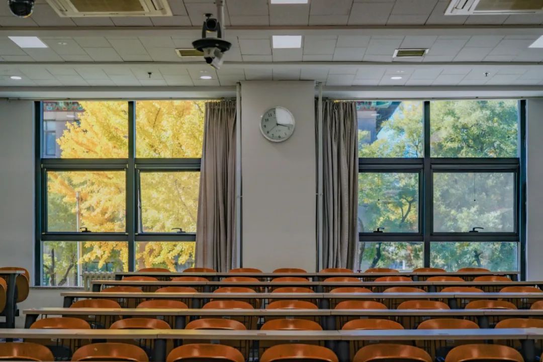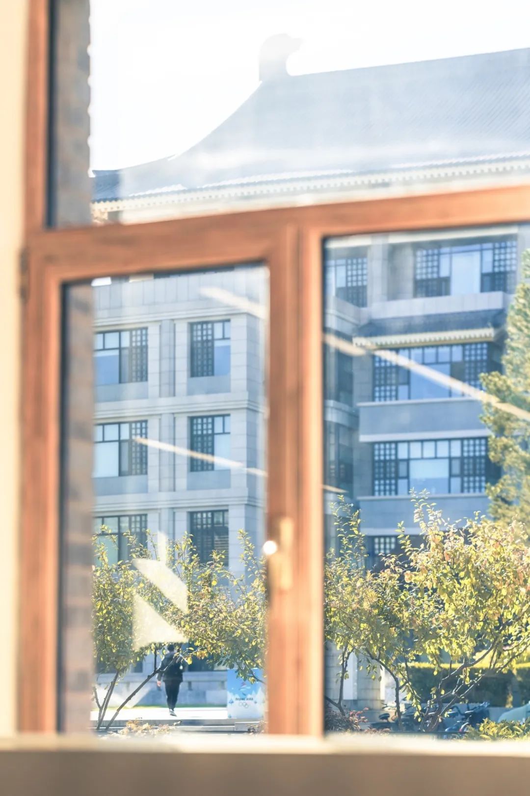 未名湖畔,教学楼旁教室窗明几净,光影静谧澄明