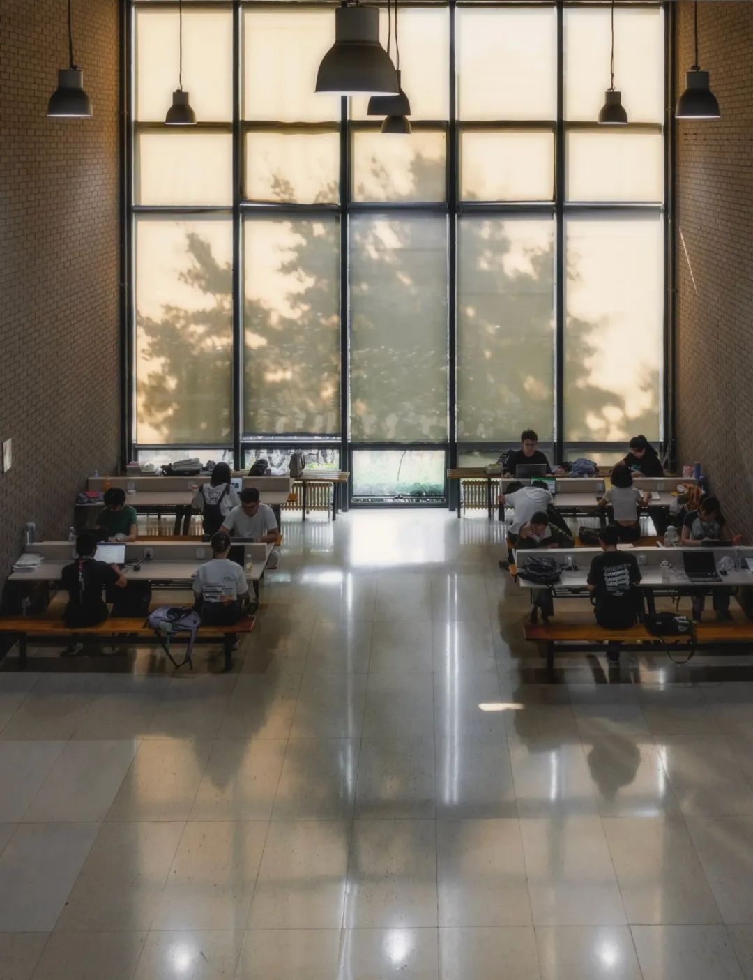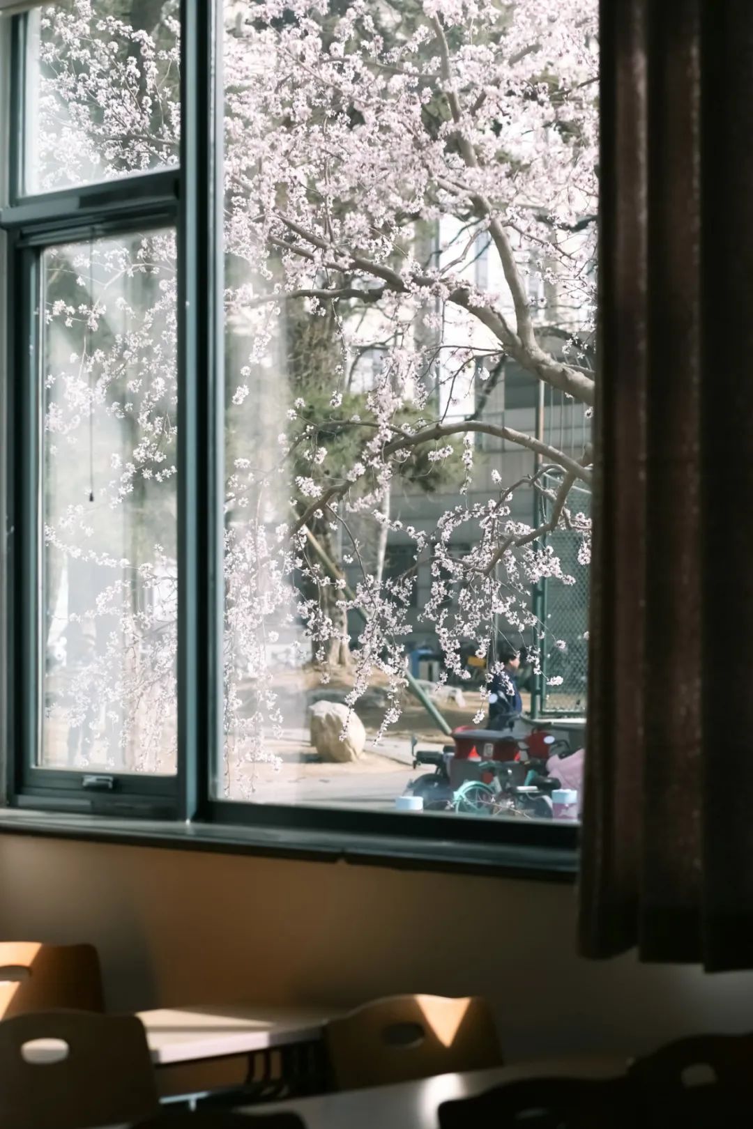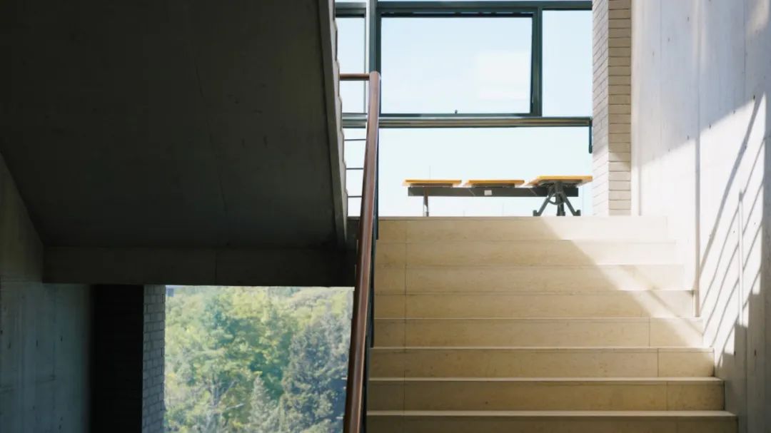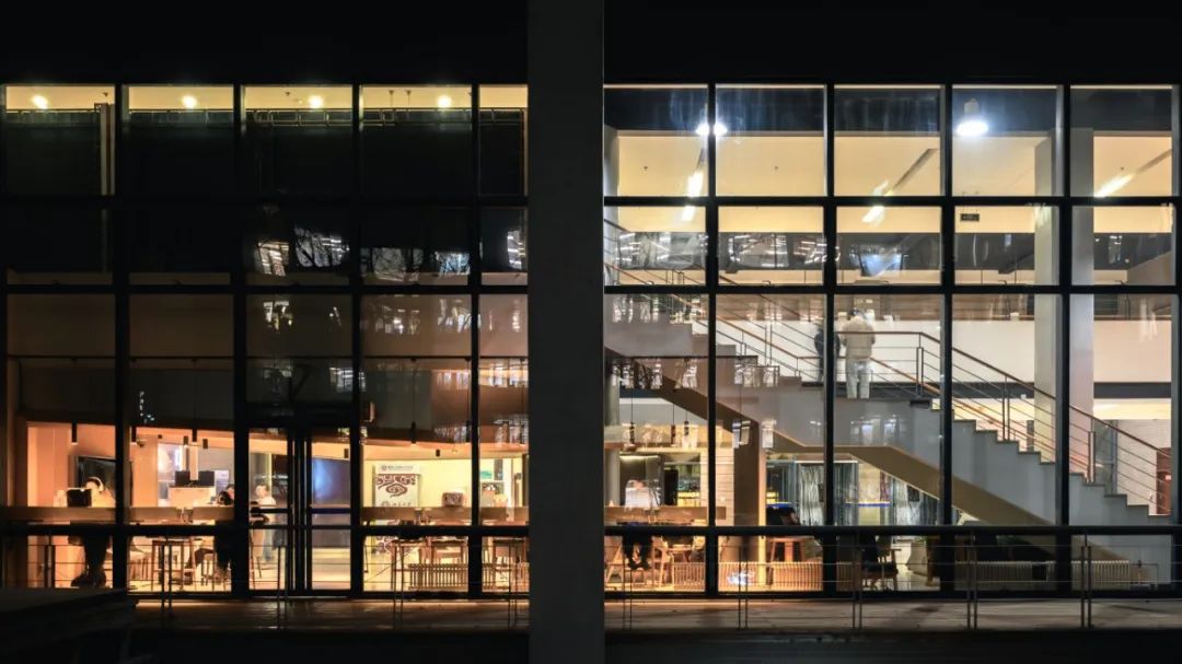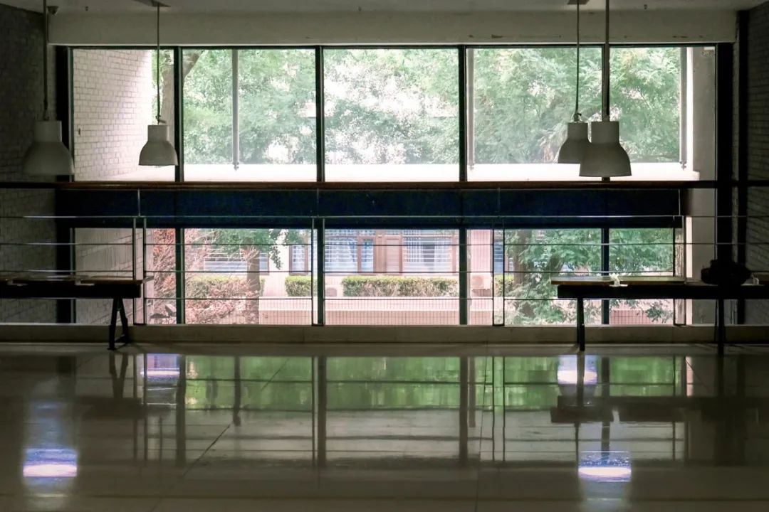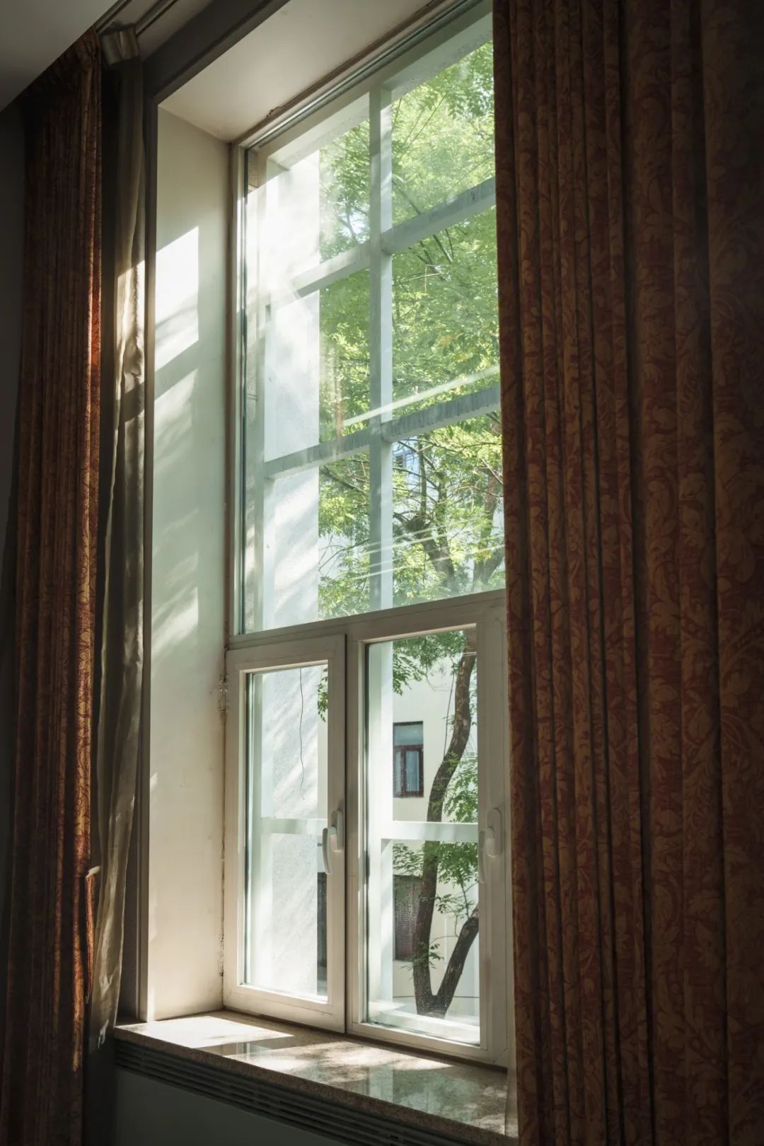未名湖畔,教学楼旁教室窗明几净,光影静谧澄明