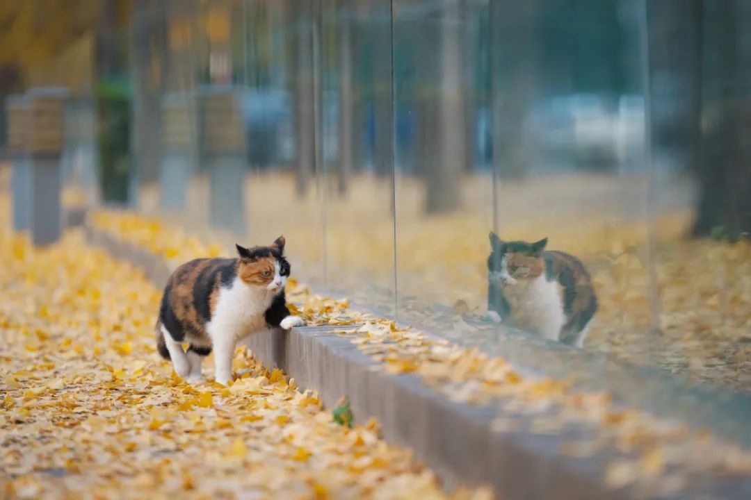 活泼灵动的猫咪啊落叶之上蹲伏,转头照见自己