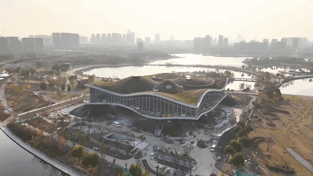 记者在项目现场看到,工程已进入收尾阶段。从空中俯瞰,场馆一层如起伏的山谷散布在道路之间,二层如一片云轻柔地飘落在一层山谷上,在湖水的掩映下,建筑显得轻盈而通透,为平川沃野的城市增添了起伏的绿丘和波动的壳体空间。据介绍,这座建筑突破了传统的结构形式,采用了80米见方的壳体结构和近30米的悬挑。