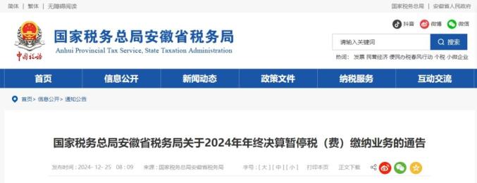 尊敬的纳税人、缴费人:按照国务院办公厅2025年元旦节假日安排,为配合人民银行、商业银行共同做好2024年全省税费收入年终决算工作,国家税务总局安徽省税务局将暂停各项税(费)缴纳业务。具体通知如下: