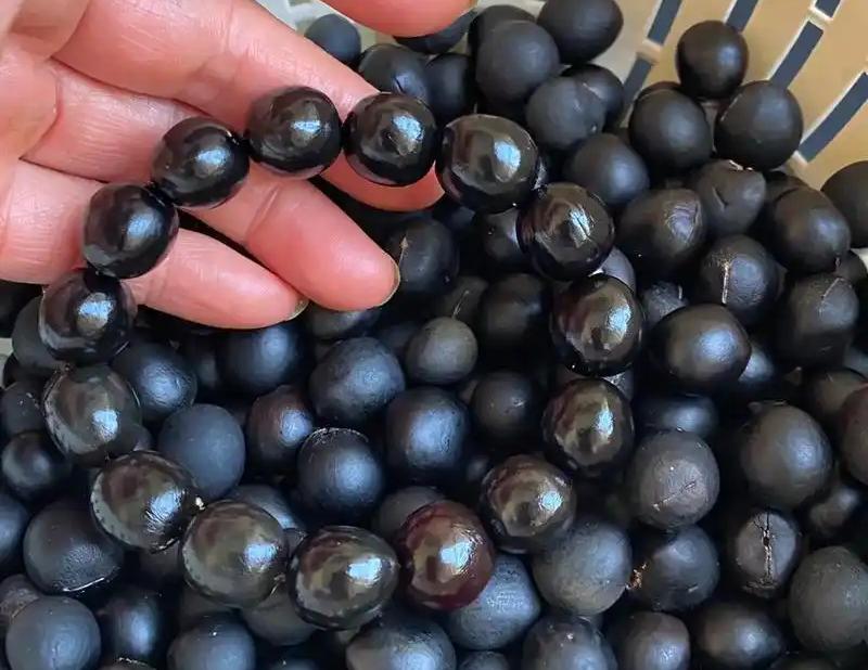 无患子。图库版权图片,转载使用可能引发版权纠纷成熟的无患子果实外果皮肉质,呈奶黄色。剥掉外面这柔软的一层,露出的是坚硬圆润的“果核”,表面乌黑油亮,随着把玩会愈发光亮,是做珠子的上乘材料。