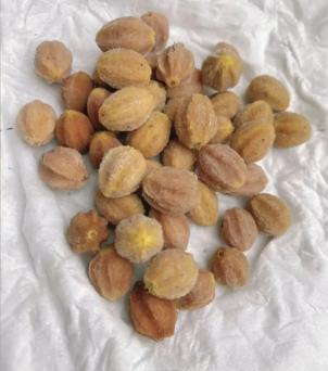 挂在树上的苦楝子成熟的苦楝子外果皮也呈黄色,剥离外层肉质的果皮,就能看到木质坚硬的“果核”,这是苦楝子的内果皮,内部包裹着种子。“果核”呈钝圆形,表面呈黄白色至蜡黄色,有数条纵深的沟纹。