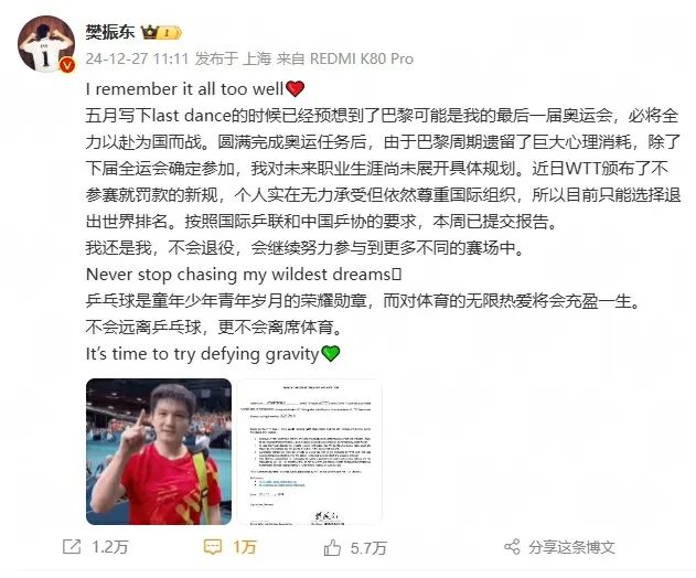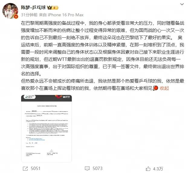 樊振东、陈梦微博两人的文字里都提到了WTT出台的退赛罚款规定,提到了巴黎周期的消耗以及未来生涯的规划,我们基于他们的表述和相关规则,尝试着简单梳理一下具体情况: