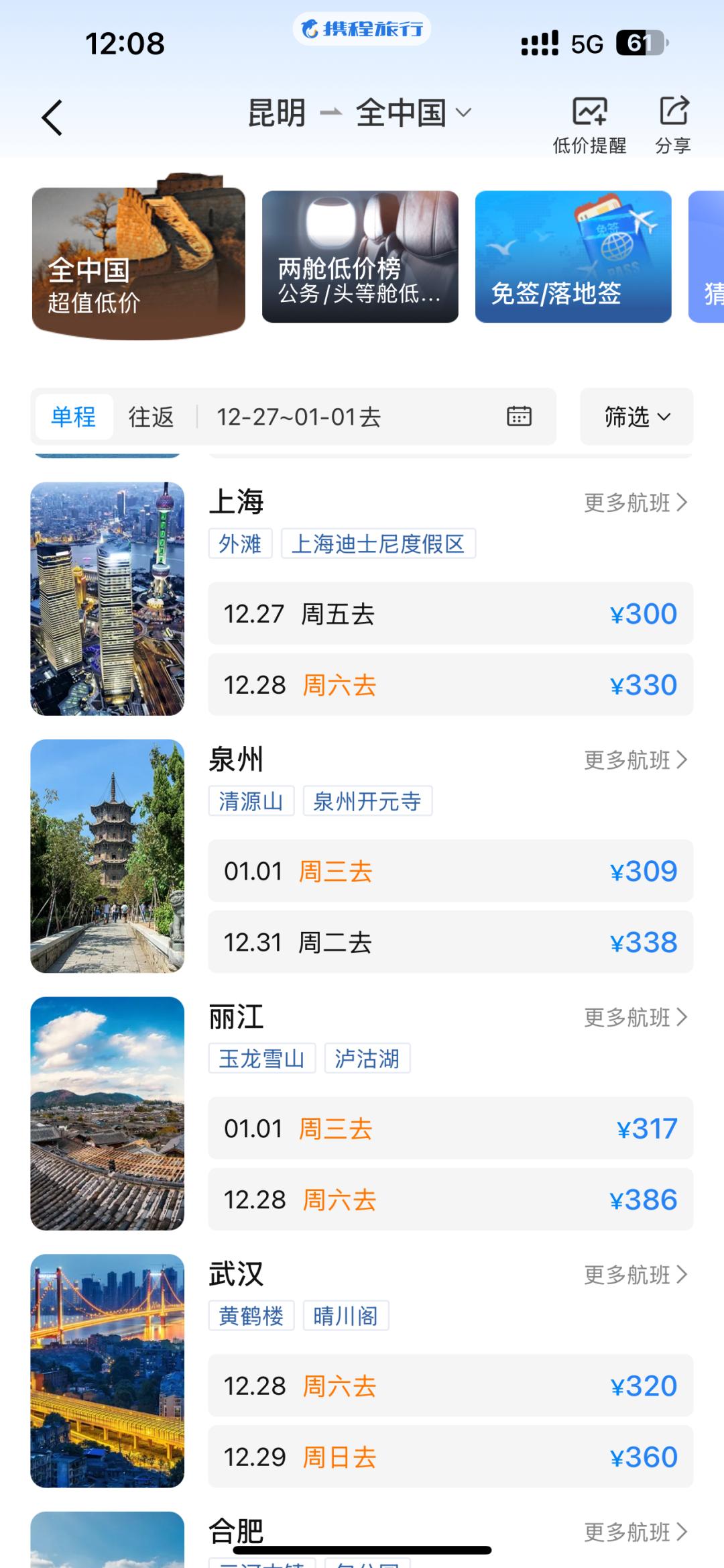 热门城市的机票