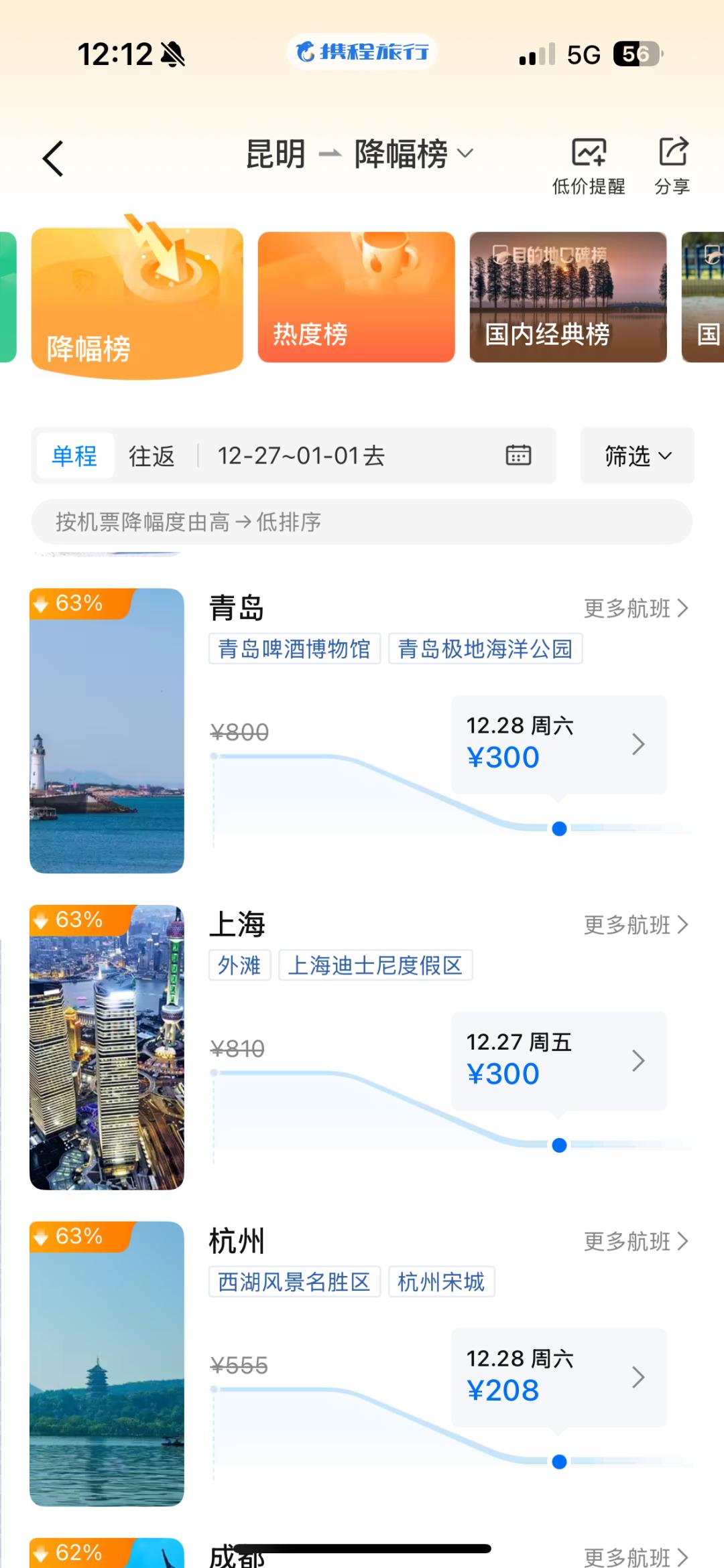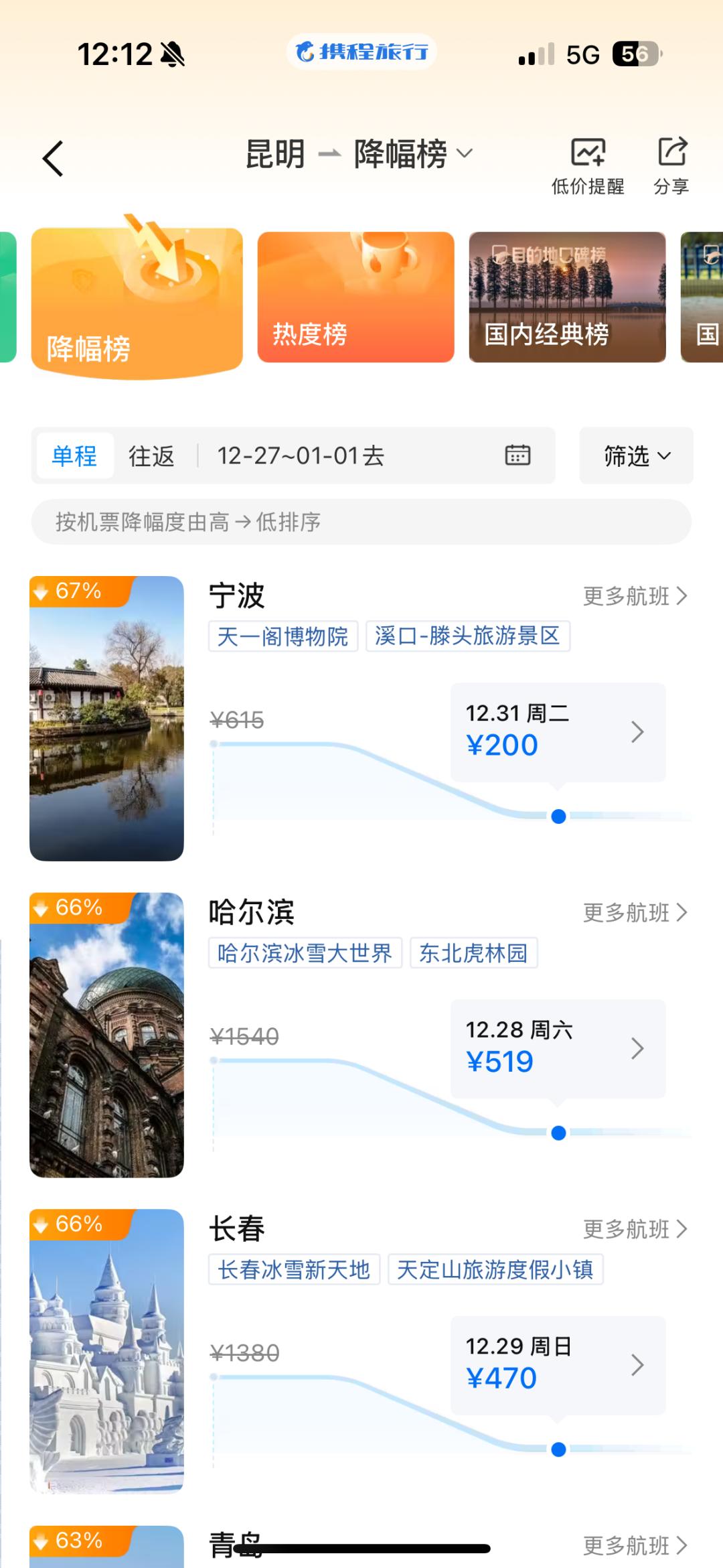 昆明到哈尔滨降幅66%