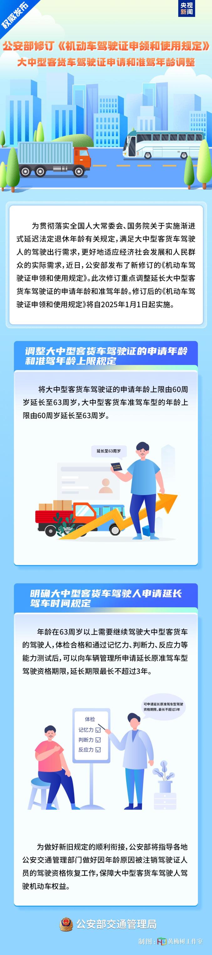近日,公安部发布了新修订的《机动车驾驶证申领和使用规定》。此次修订重点调整延长大中型客货车驾驶证的申请年龄和准驾年龄,积极保障群众就业权益。修订后的《机动车驾驶证申领和使用规定》将自2025年1月1日起实施。