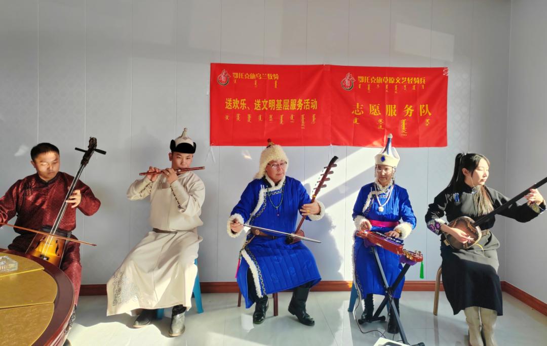 乌兰牧骑作为草原上的“红色文艺轻骑兵”,在公共文化服务体系建设中同样有着不可替代的作用。在鄂托克旗苏米图苏木马什亥嘎查,乌兰牧骑志愿者服务队来到了牧民斯庆巴德尔呼的家中。他们与斯庆巴德尔呼一家欢聚一堂,共同演唱了鄂尔多斯民歌联奏《乌仁堂乃》《甘德尔梁》和《黑缎子坎肩》。这些悠扬的旋律仿佛诉说着草原的故事,让在场的每一个人都深受感动。