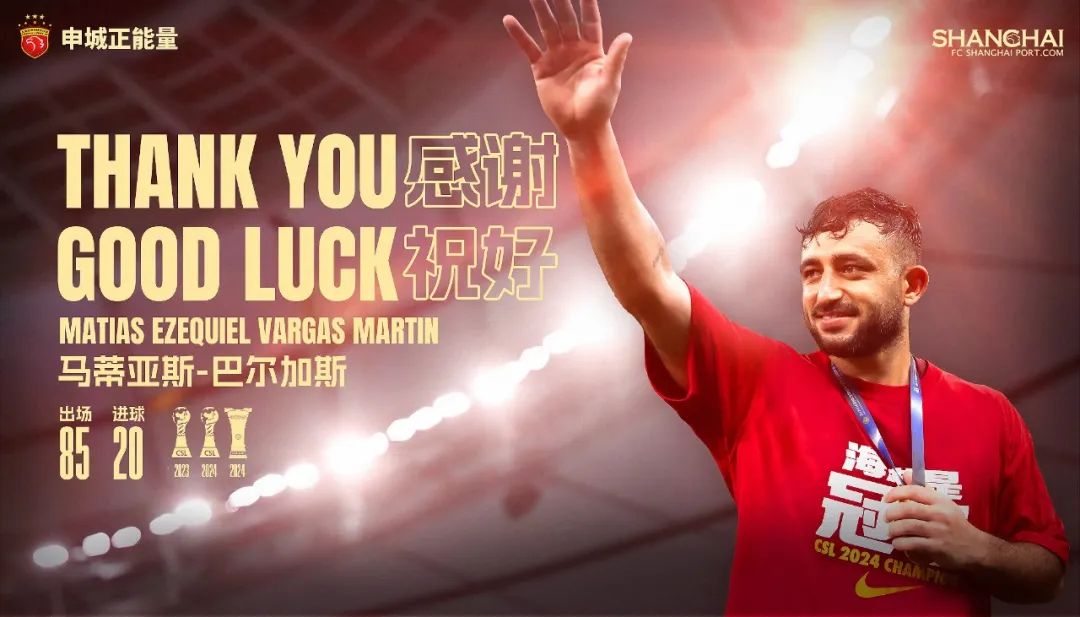 上海海港俱乐部通过社交媒体发文表示:经与球员本人友好协商并达成一致,阿根廷球员马蒂亚斯·巴尔加斯正式离队。俱乐部充分尊重、支持球员对其职业生涯的全新规划,同时对球员表示衷心的感谢与祝福。