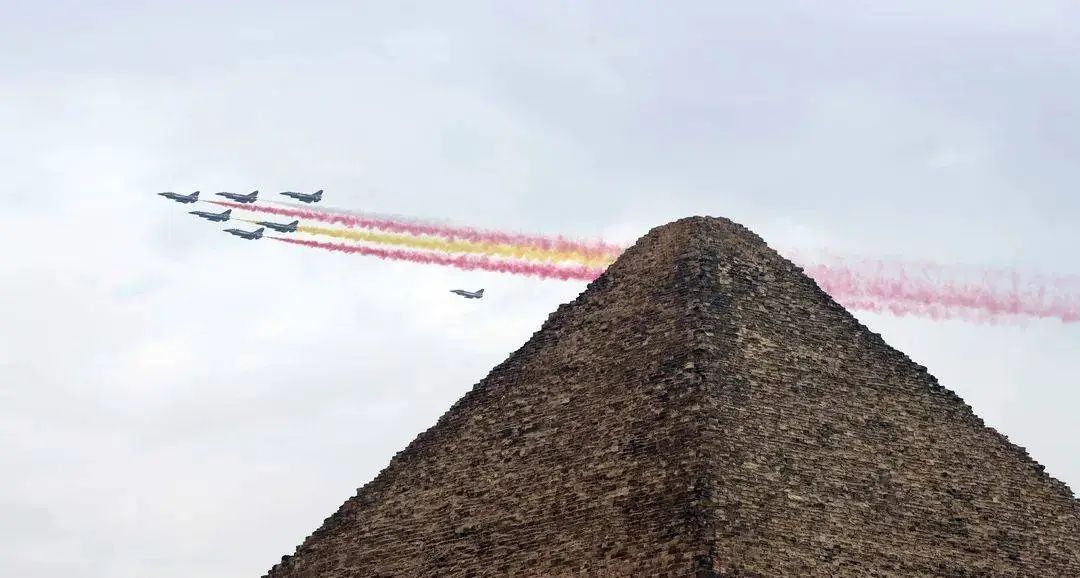 空军八一飞行表演队飞越金字塔。多款飞机上演“空中舞蹈”