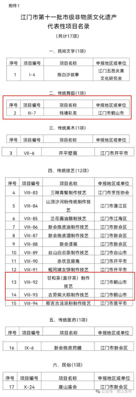 近日,广东省文化和旅游厅、广东省非物质文化遗产保护中心公布了江门市第十一批市级非物质文化遗产代表性项目名录,其中鹤山市3项入选江门市级非物质文化遗产代表性项目名录。