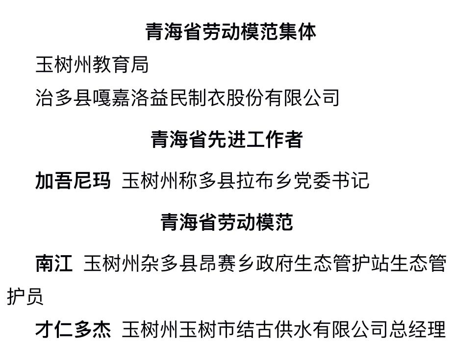 喜报!玉树2个集体、3个个人荣获青海省劳动模范集体、劳动模范和先进工作者称号