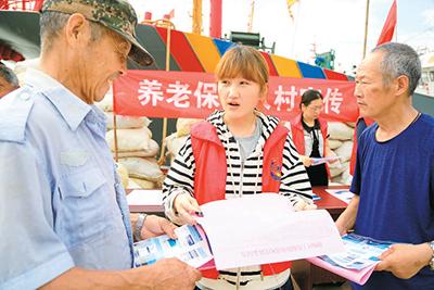 江苏省连云港市赣榆区人社局工作人员在青口渔港开展养老保险政策宣传。
