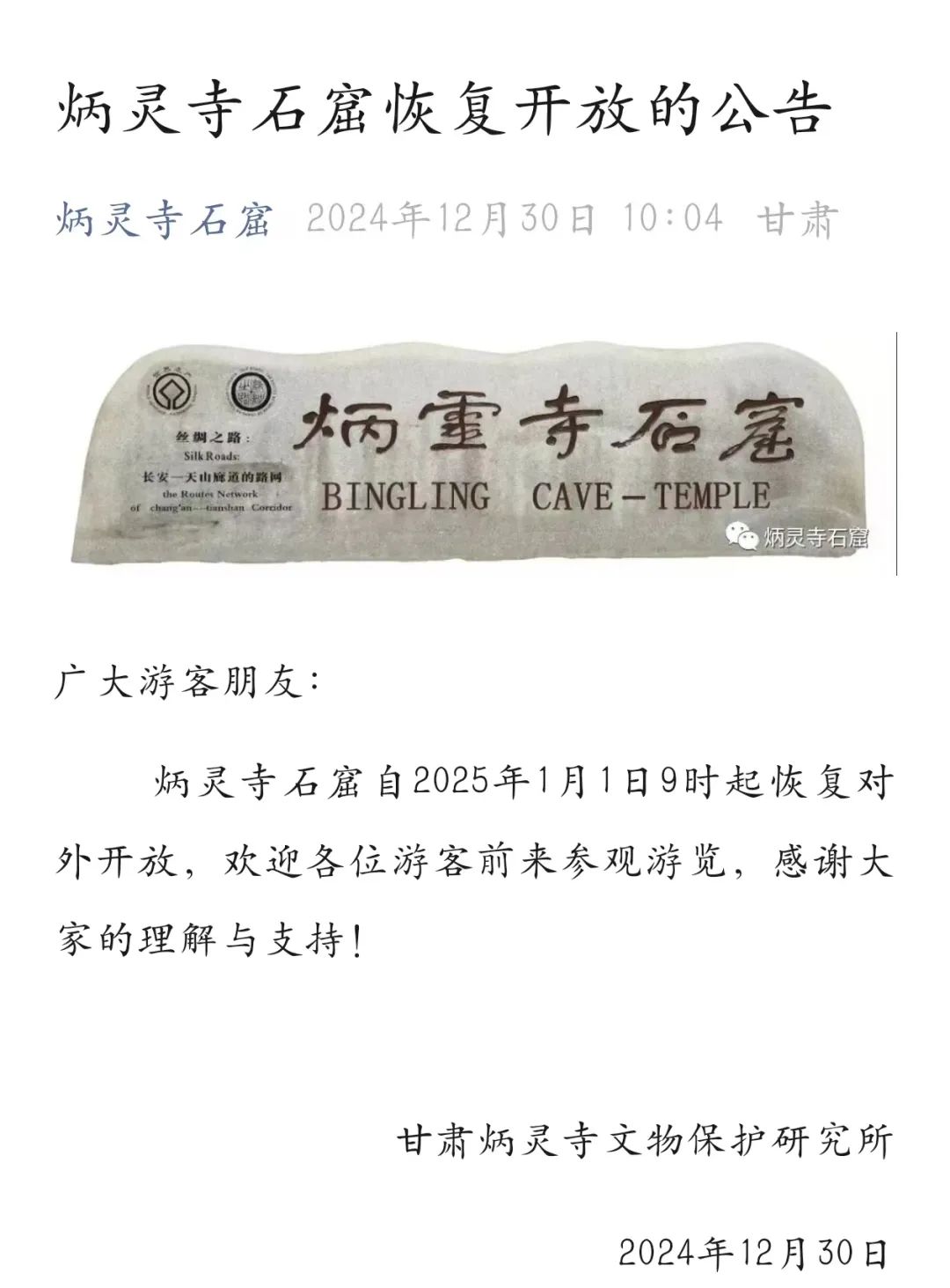1.炳灵寺石窟景点于2025年1月1日9时起恢复对外开放;