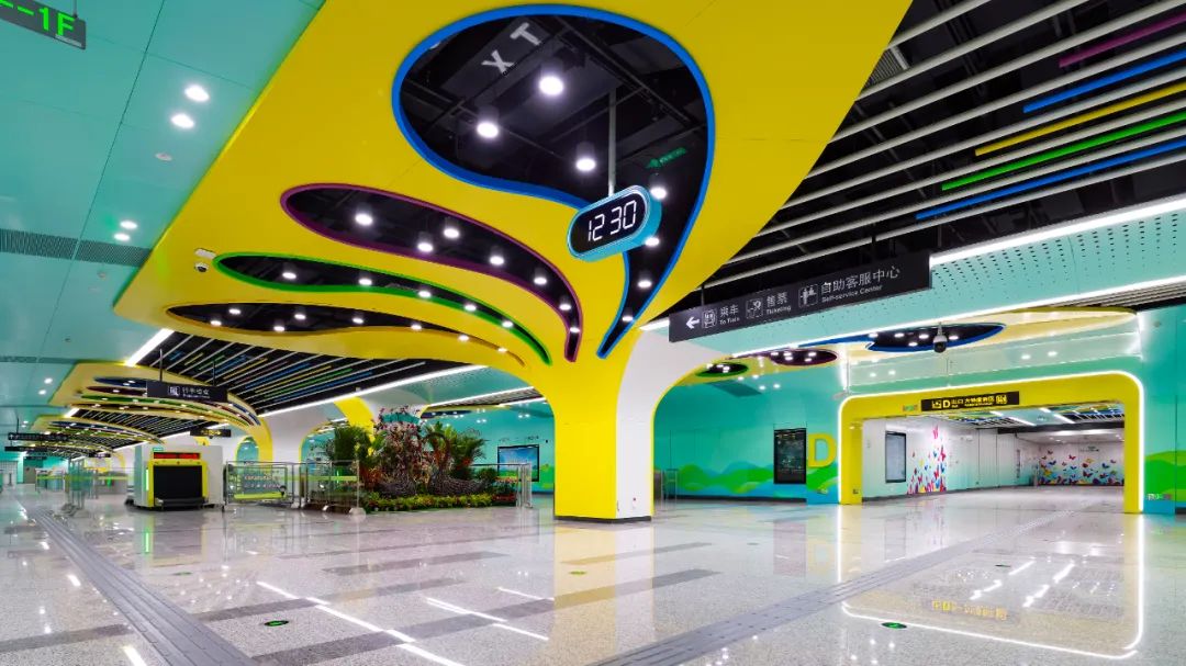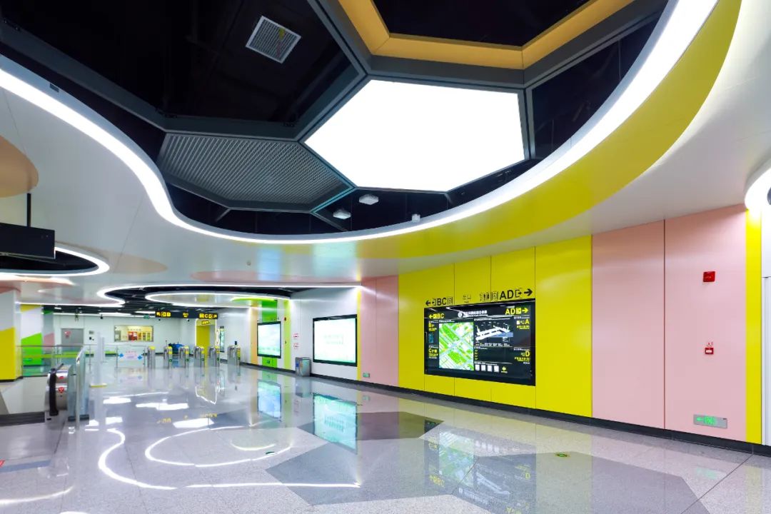 绿博园站以“春风化蝶”为文化元素,加入春天的色彩与几何构型,通过色彩与构型的变化,破茧而生来呼应翻天覆地的城市发展变化。