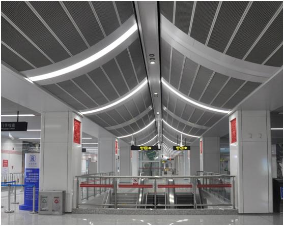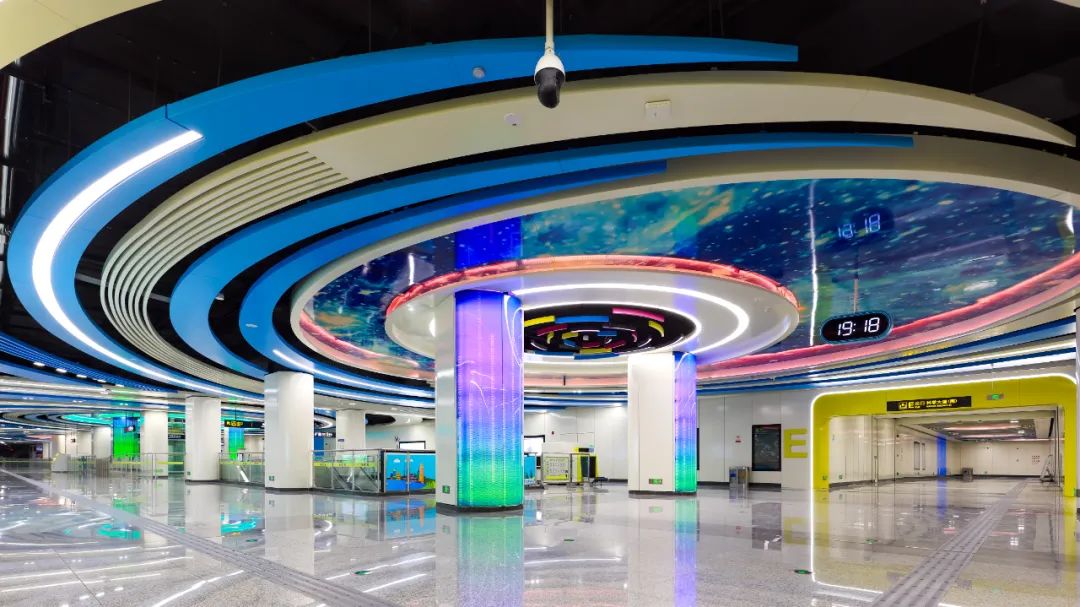 白庙站匠心独运,将拱顶空间设计与墙面科技艺术灯光完美融合,营造出浩瀚无垠的星空景象,不仅深刻映射出郑州古代天文学文化的辉煌成就,更生动展现了郑州现代科技日新月异的蓬勃发展态势。