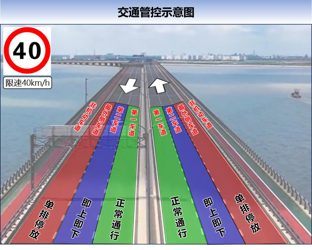 1、2024年12月31日16时起,公安部门将对田湾跨海大桥开始管控,所有车辆限速40km/h,允许车辆靠最外侧车道单排停放,过往车辆可在第一车道(即行驶方向最左侧车道)、第二车道通行,第二车道可即上即下、但不得停留;