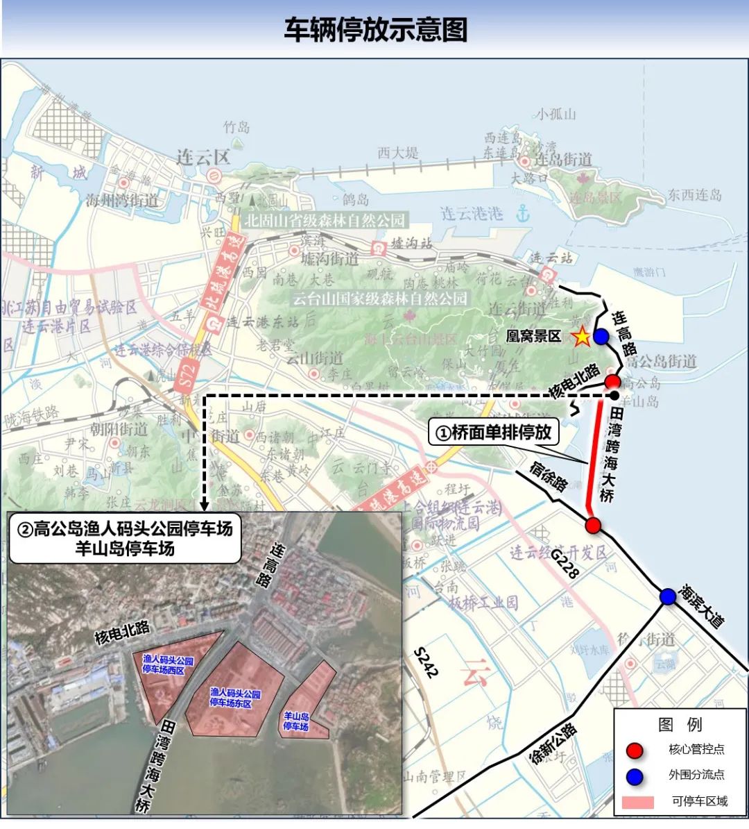 桥面双向单排停满后,后续车辆可选择田湾跨海大桥北端高公岛渔人码头公园停车场、羊山岛停车场停放;