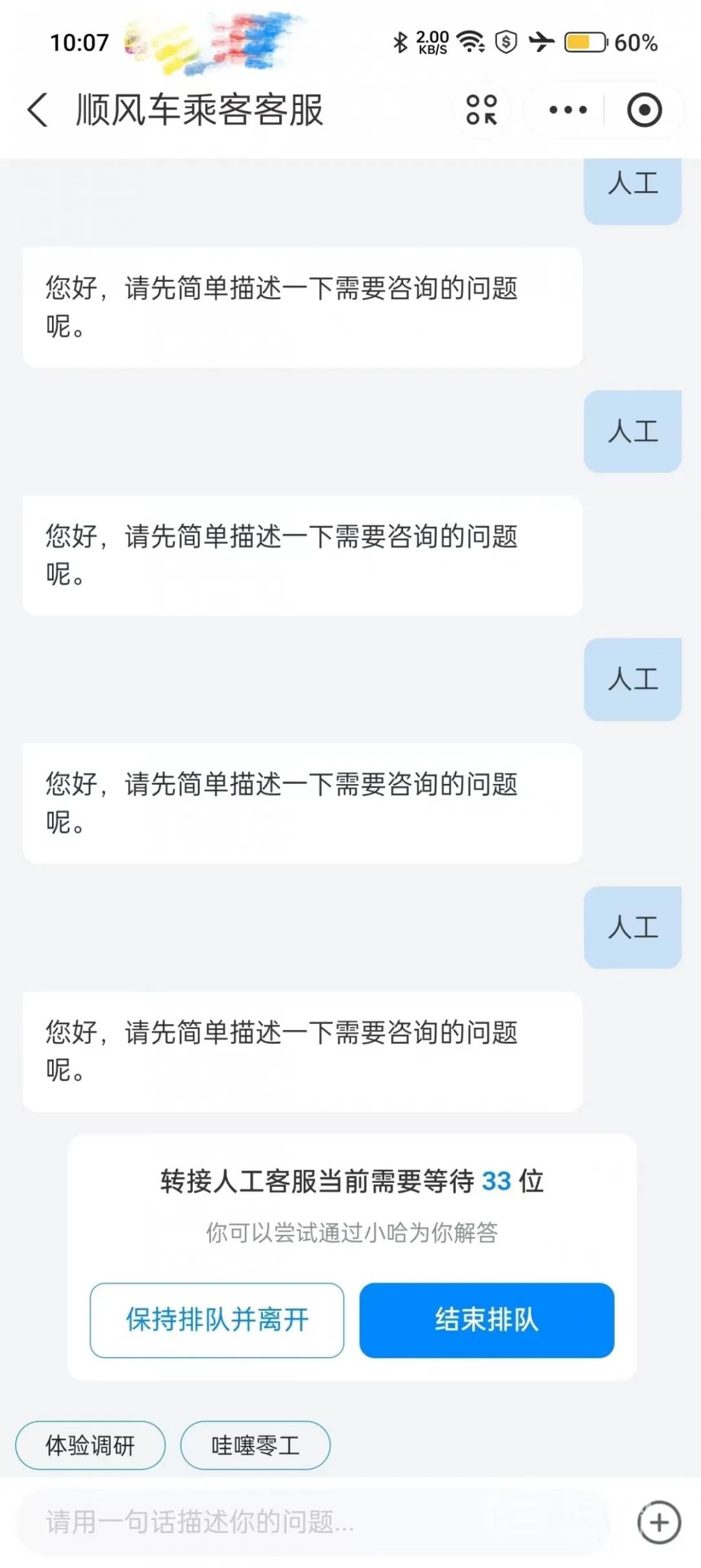 平台人工客服接入困难。(来源:受访者)