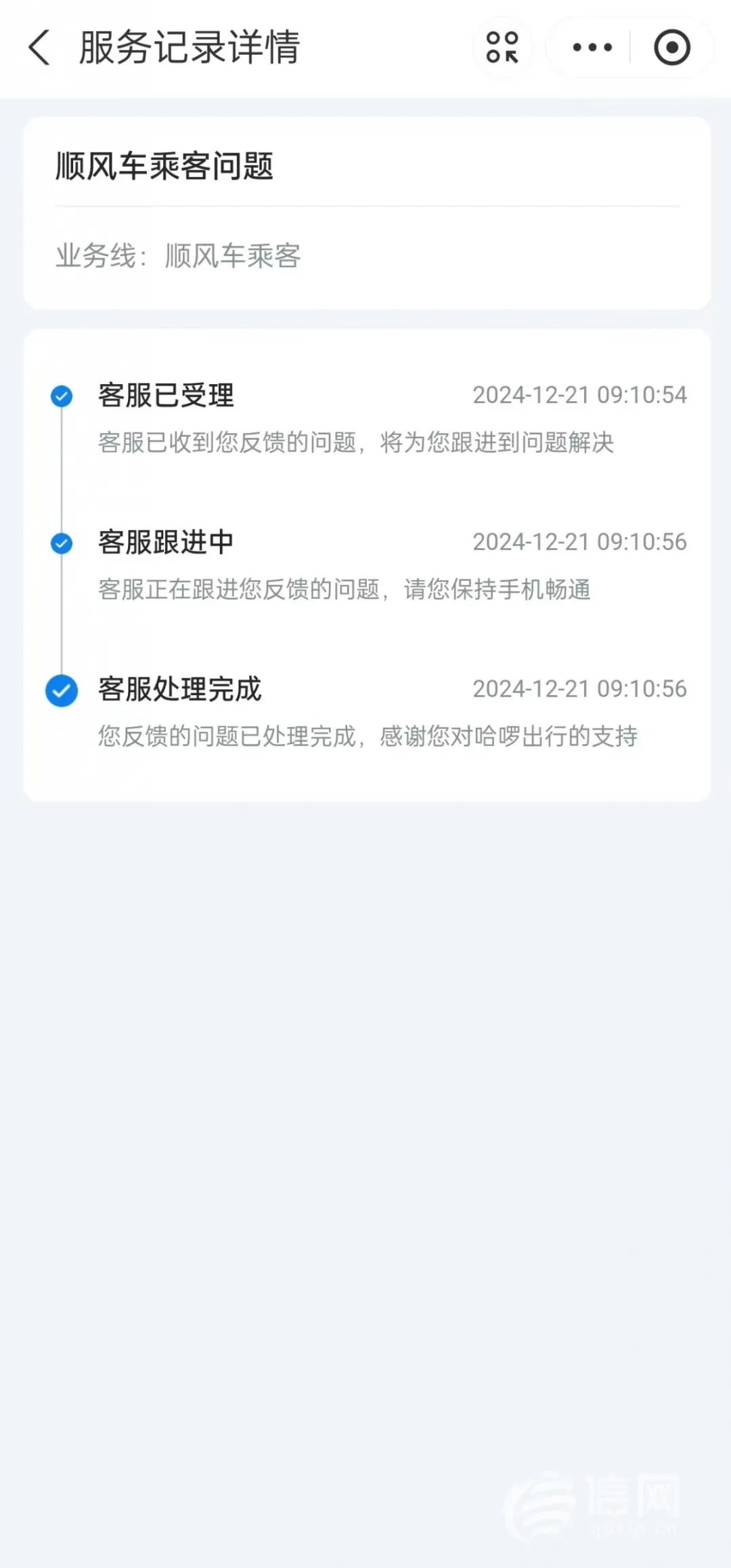 哈啰平台客服回访电话需要用户在响铃7秒、11秒内接听。(来源:受访者)近日,市民金先生将自己的一次哈啰顺风车出行经历分享在了个人社交平台,引发了网友的关注。信网在联系到当事人金先生后,据他介绍,12月21日,他花“独享”价乘顺风车,上车后却被迫拼车,行程中司机随意变更路线,致使行程安全隐患丛生。后续投诉时,客服虽然承认平台有过错,但处理了整整一周时间也未能给其一个满意的答复。信网(0532-80889431)注意到,类似金先生的遭遇还有很多,众多消费者都曾在各大社交平台反映过类似问题,投诉者普遍认为,哈啰平台存在很多亟待解决的问题。