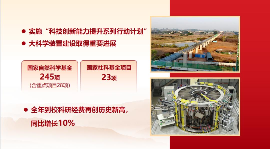 实施“科技创新能力提升系列行动计划”,“多态耦合轨道交通动模试验平台”、准环对称“仿星器”两个大科学装置建设取得重要进展。获批国家自然科学基金245项(含重点项目28项)、国家社科基金项目23项,全年到校科研经费再创历史新高。6项科技成果荣获2023年度四川省科学技术一等奖,一等奖总数位列全省第一,3项科技成果荣获2023年度国家科学技术奖,重点参与“复兴号”高速列车项目荣获2023年度国家科学技术进步奖特等奖。11