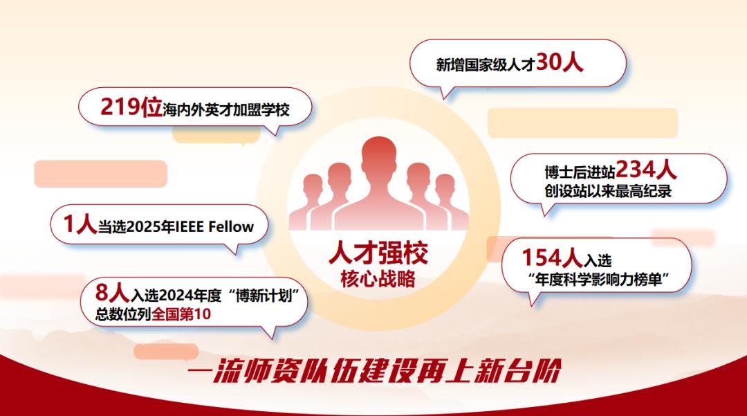 学校实施“人才强校核心战略”,高层次人才年度入选总量创历史新高,219位海内外英才加盟学校,博士后进站234人,154人入选“年度科学影响力榜单”,8人入选2024年度“博新计划”,总数位列全国第10,一流师资队伍建设再上新台阶。12