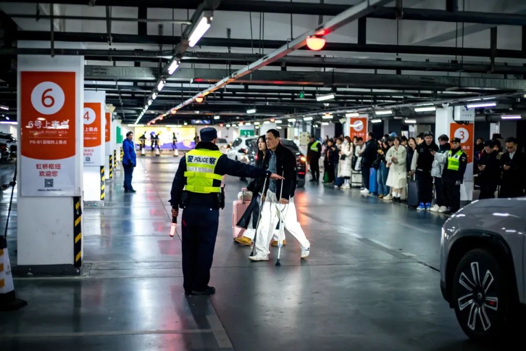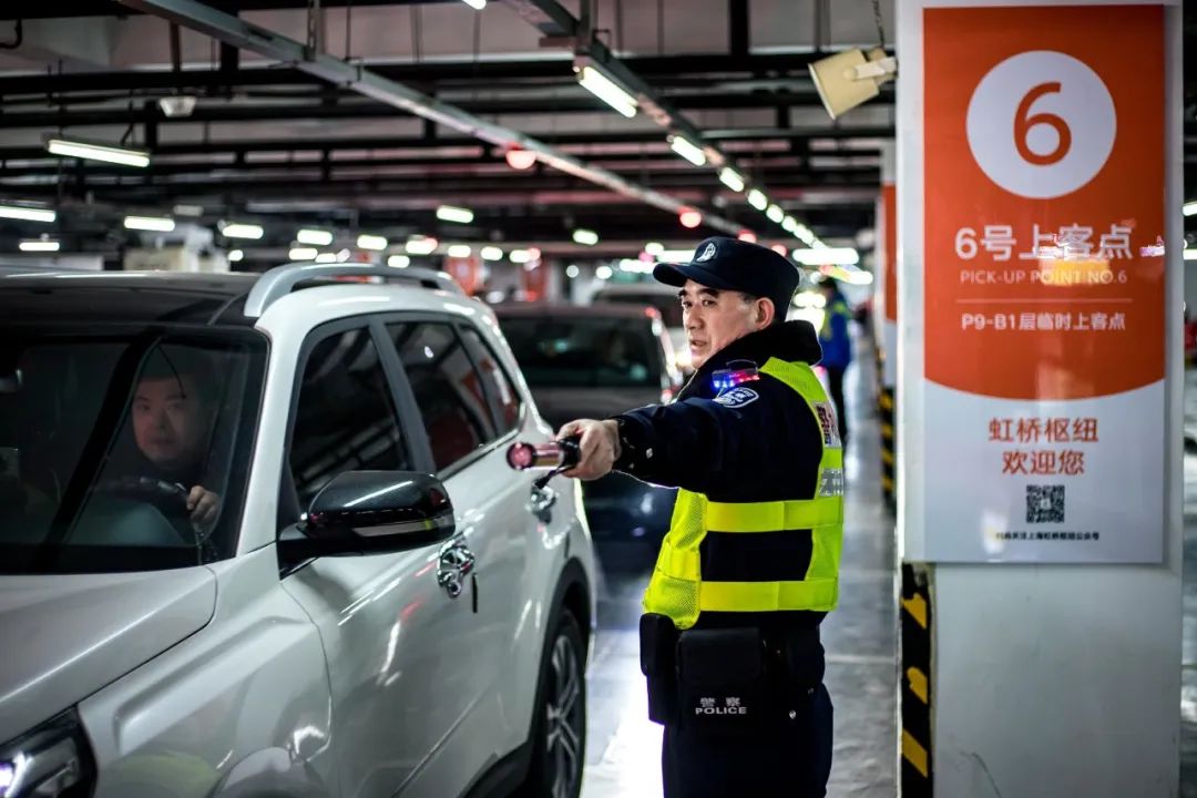 在虹桥枢纽P9、P10停车库临时上下客点车流平稳有序,并未出现明显拥堵点