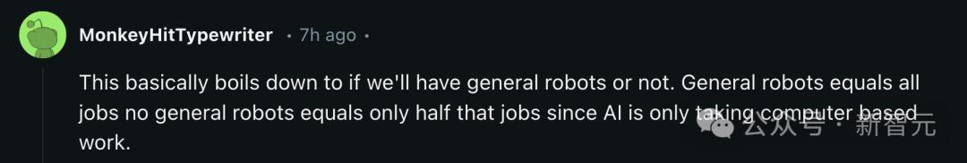 如果有了通用机器人,就意味着所有工作都会受到影响;如果没有通用型机器人,那么只有一半的工作岗位会受到影响,因为AI只能取代基于计算机的工作」。