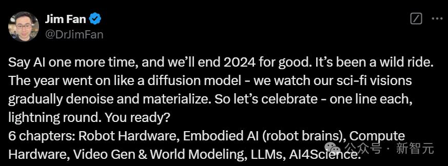 英伟达高级研究科学家Jim Fan,从6个方面总结了2024年。