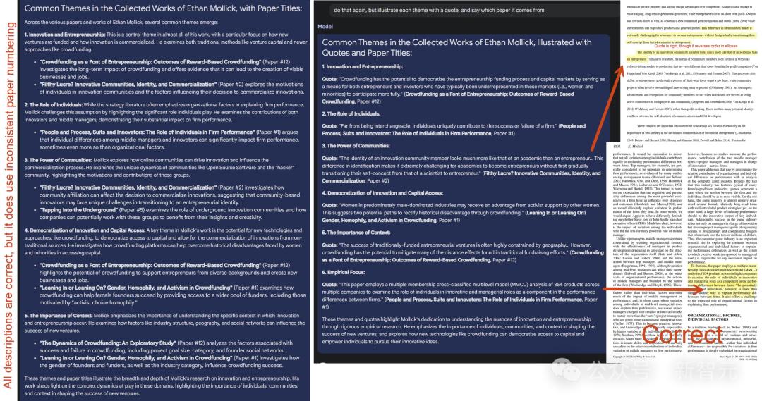 例如,Mollick在向Gemini Pro输入了自己2022年之前所写的20篇论文和著作,总计超过1000多页的PDF文件后,模型借助强大的「长上下文窗口」能力,很快便提取出了直接引用并找到了所有文献中的主题,同时只有几处微小的错误。