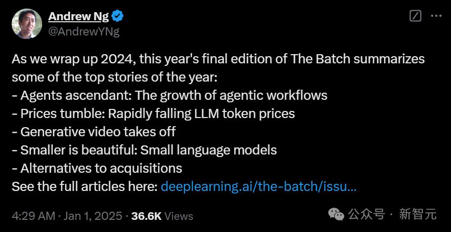 吴恩达总结了2024年AI圈的热门故事:AI智能体崛起,LLM token价格暴跌,生成式视频迎来爆发期,小模型异军突起。