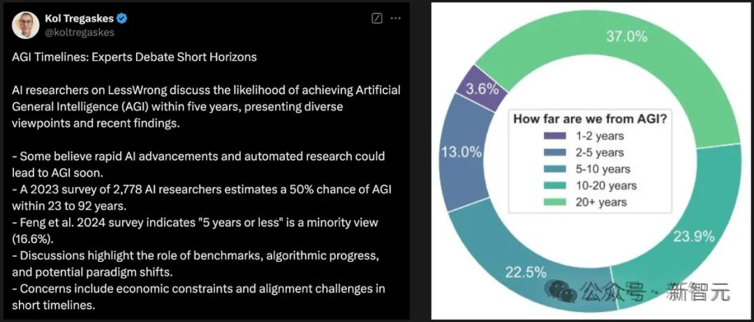 2023年,在对2,778名AI研究人员的一项调查显示,AGI实现有50%的可能性在23-92年之间。然而,时间跨度仅过去了一年,最新调查却显示,16.6%受访者认为AGI会在5年或更短的时间内实现