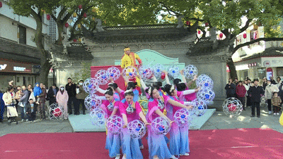 而在老街照壁前,来自张弄村的演员们手持滚灯,在欢快的节奏中灵活舞动,为节日增添了喜庆与欢乐。演员们也同样热情邀请大家一起来尝试舞动滚灯,体验这种集舞蹈、杂技与武术于一体的传统民间艺术。孩子们个子还没有滚灯高,却一个个兴致勃勃,有的捧滚灯、有的举滚灯,现场一片欢声笑语。