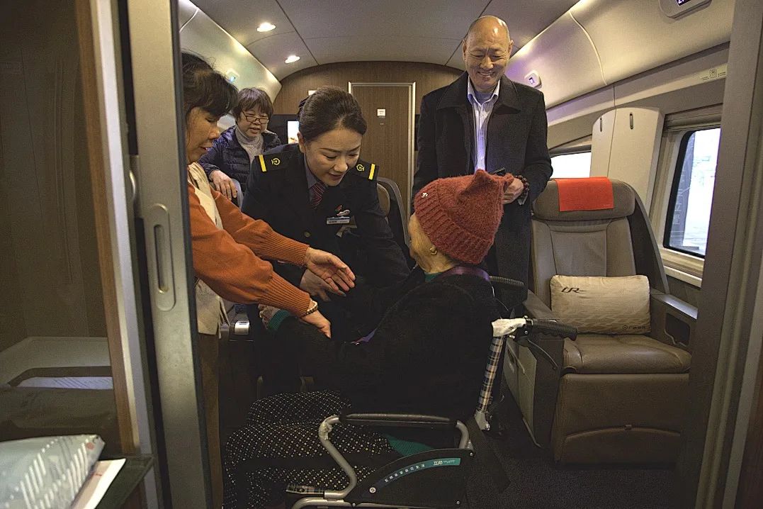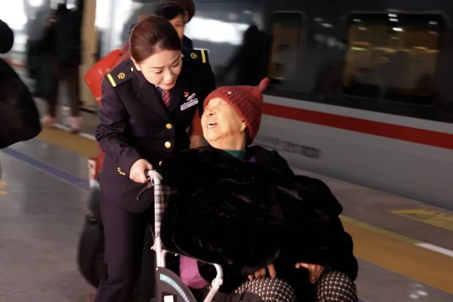 张雨茜全程推着轮椅,带着刘先生一家通过直梯到达候车厅,经过绿色通道换乘G1623次列车。期间,她协调乘务员调整座位,帮忙搀扶老人,将老人安置舒适妥当,才放心离开。临别时,老人紧握着她的手说:“姑娘,手这么凉,要多穿一点衣服。”