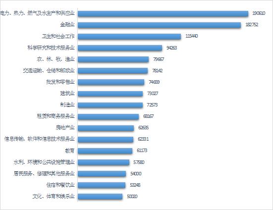 ▶文化、体育和娱乐业、住宿和餐饮业工资报酬水平较低,分别是50020元/年、53248元/年。