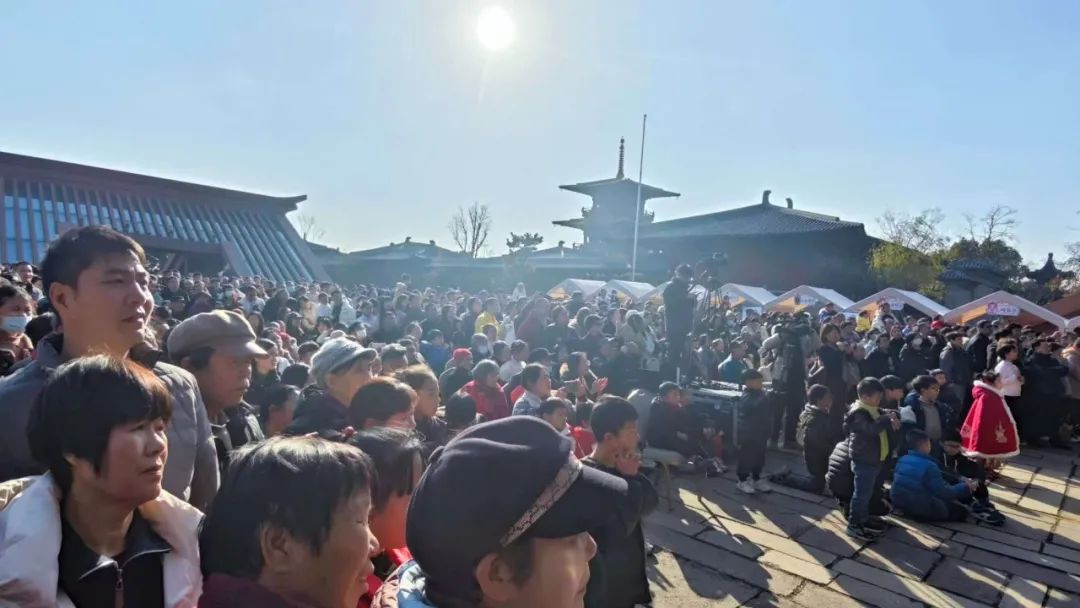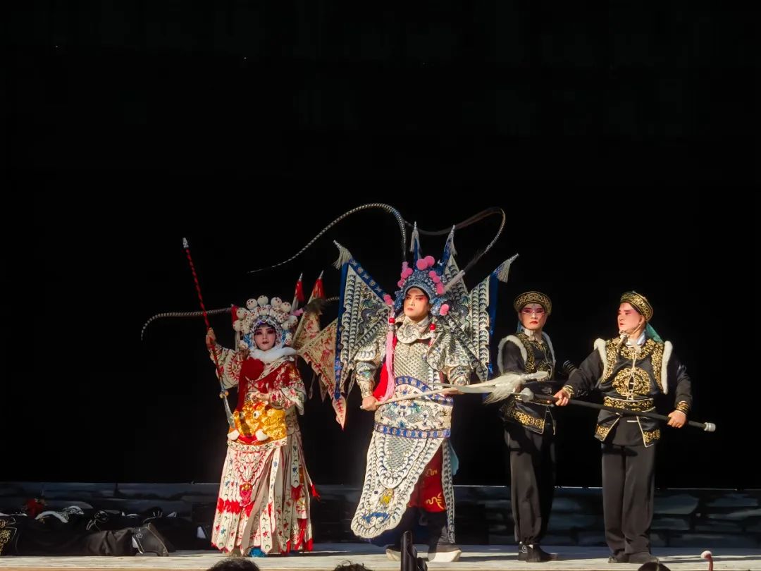 14点30分,鸣锣开戏,戏台前立即被围得里三层外三层。二十多名民乐演奏师吹啦弹敲一曲《花头台》,年味就搅浓了。随后折子戏《打金砖》登场,饰演汉光武帝的演员刘秀十八般“僵尸躺”引来观众阵阵叫好;40余人登台的《大破天门阵》中,穆桂英挥刀“破天门”,连胜108阵的华丽阵容更是赢得满堂喝彩。