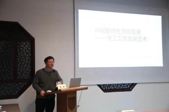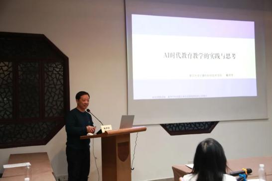 复旦大学教学发展中心特邀研究员、计算机科学技术学院戴开宇副教授受邀到现场,就“AI时代教育教学的实践与思考”作重要分享。他结合自身教学实践与成果,全景式地介绍了包括知识图谱、深度学习、强化学习三大流派,以及大模型等人工智能技术在教学领域中的主要应用场景、实践路径及反思。戴教授提出,在信息智能文明时代,教育的首要目标是促进学生的心智发展。自我认知、批判性思维、问题意识以及信息甄别能力都是AI时代极其重要的能力和素养,教师最重要的职责是激发学生学习的内驱力,并与学生、AI形成学习共同体,成为终身学习者,共同探索智慧。AI时代呼唤理性思考