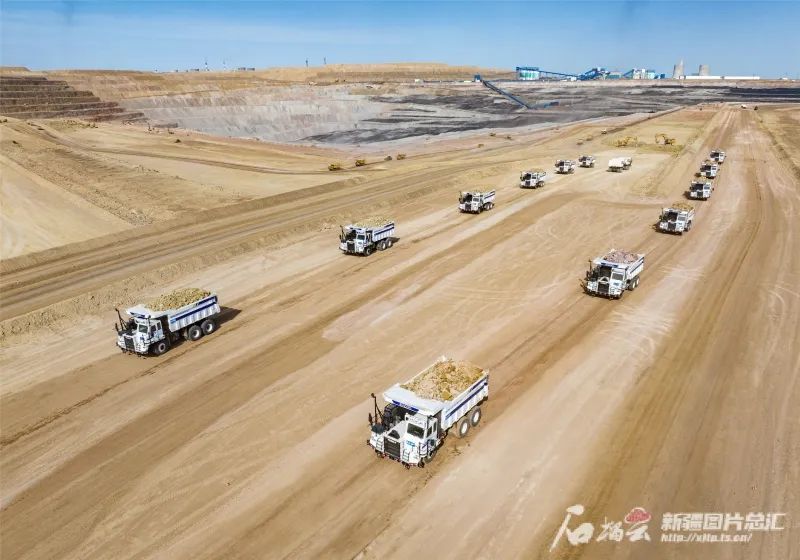 2024年10月16日,国家能源集团新疆能源有限责任公司准东露天煤矿,无人驾驶矿卡排队运送剥离土方(资料图片)。