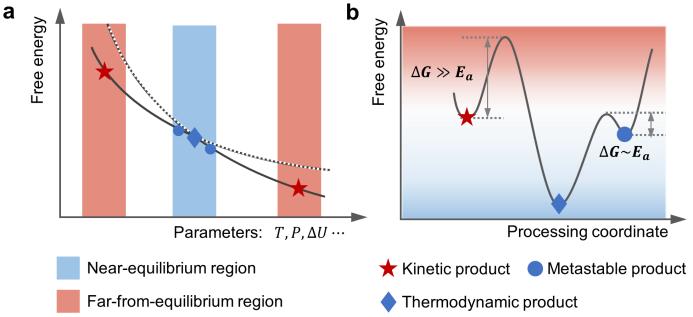 远平衡现象在自然界和材料体系中普遍存在。著名物理学家普利高津甚至称:“远平衡乃有序之源”。在材料制备过程中,无论是前驱体到产物的转变还是相变过程,系统的自由能都受到温度、压力和电势等热力学参数的显著影响(如图1)。尽管热力学决定了材料的平衡态原子构型,但动力学过程主导了构型形成的路径。在非平衡条件下,系统自由能的降低驱动着成核、晶体生长等过程。