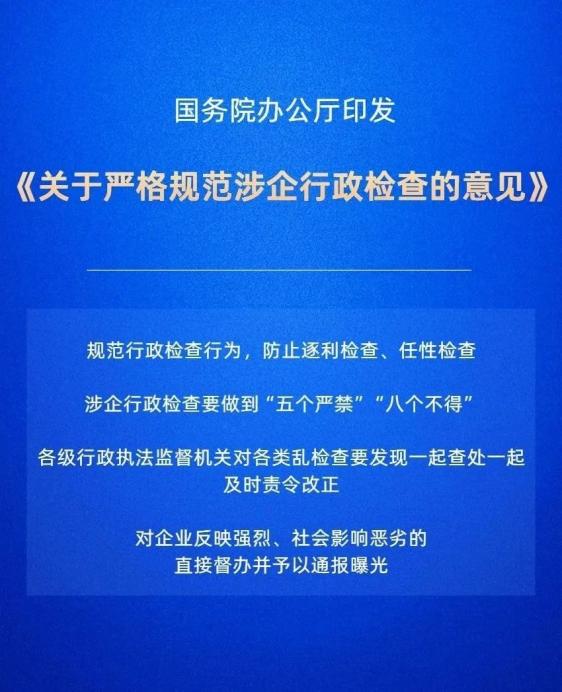 ◆ 国务院办公厅印发《关于严格规范涉企行政检查的意见》,严格规范涉企行政检查,坚决遏制乱检查,切实减轻企业负担。